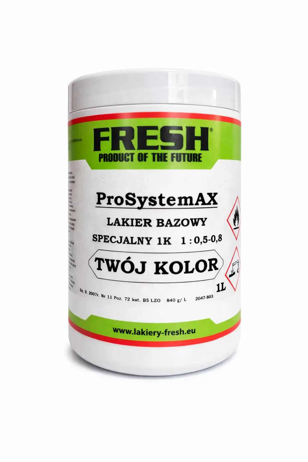 Lakier Bazowy FRESH z nowej profesjonalnej linii ProSystemAX – 1K 1:0,5-0,8 do nanoszenia pistoletem lakierniczym lub za pomocą spray. System cechuje się aktualizowaną online bazą kolorów, co oznacza dużą pasowalność. Dzięki nowatorskiej formule zapewnia doskonałe krycie. Pozwala to bardzo dobrze wykonywać naprawę lakierniczą, w znacznym stopniu zaoszczędzić czas pracy, zużycie materiału oraz przede wszystkim koszty.